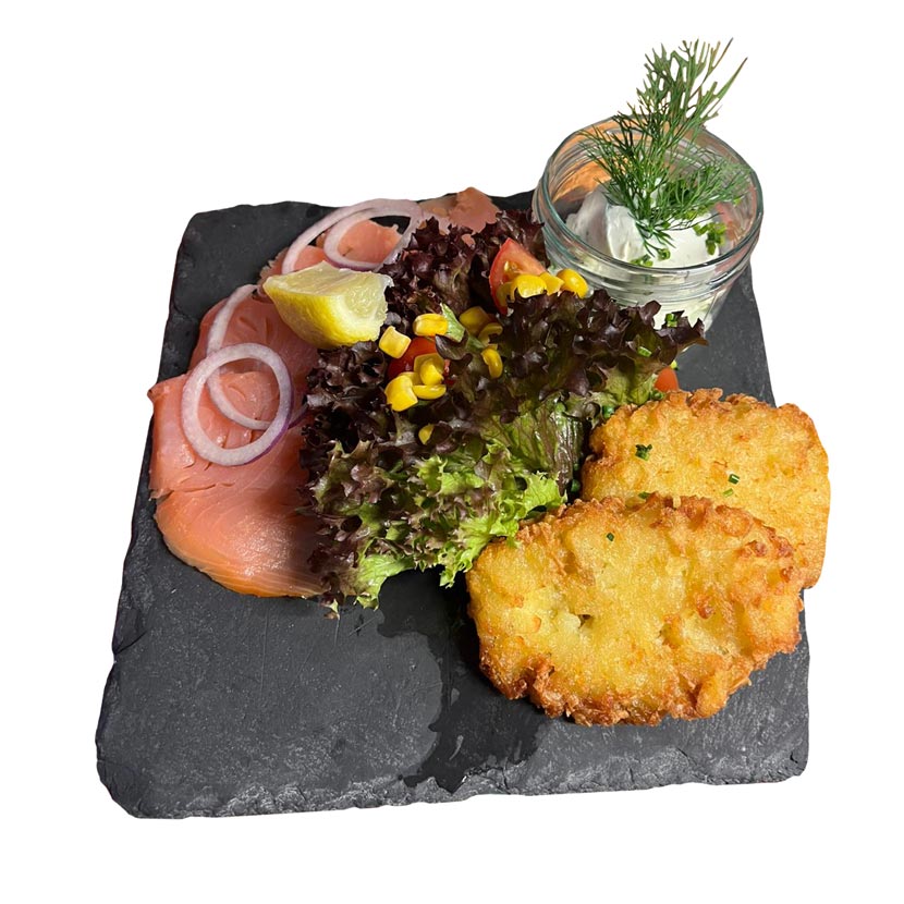 with potato pancakes, red onion and a sour cream sauce